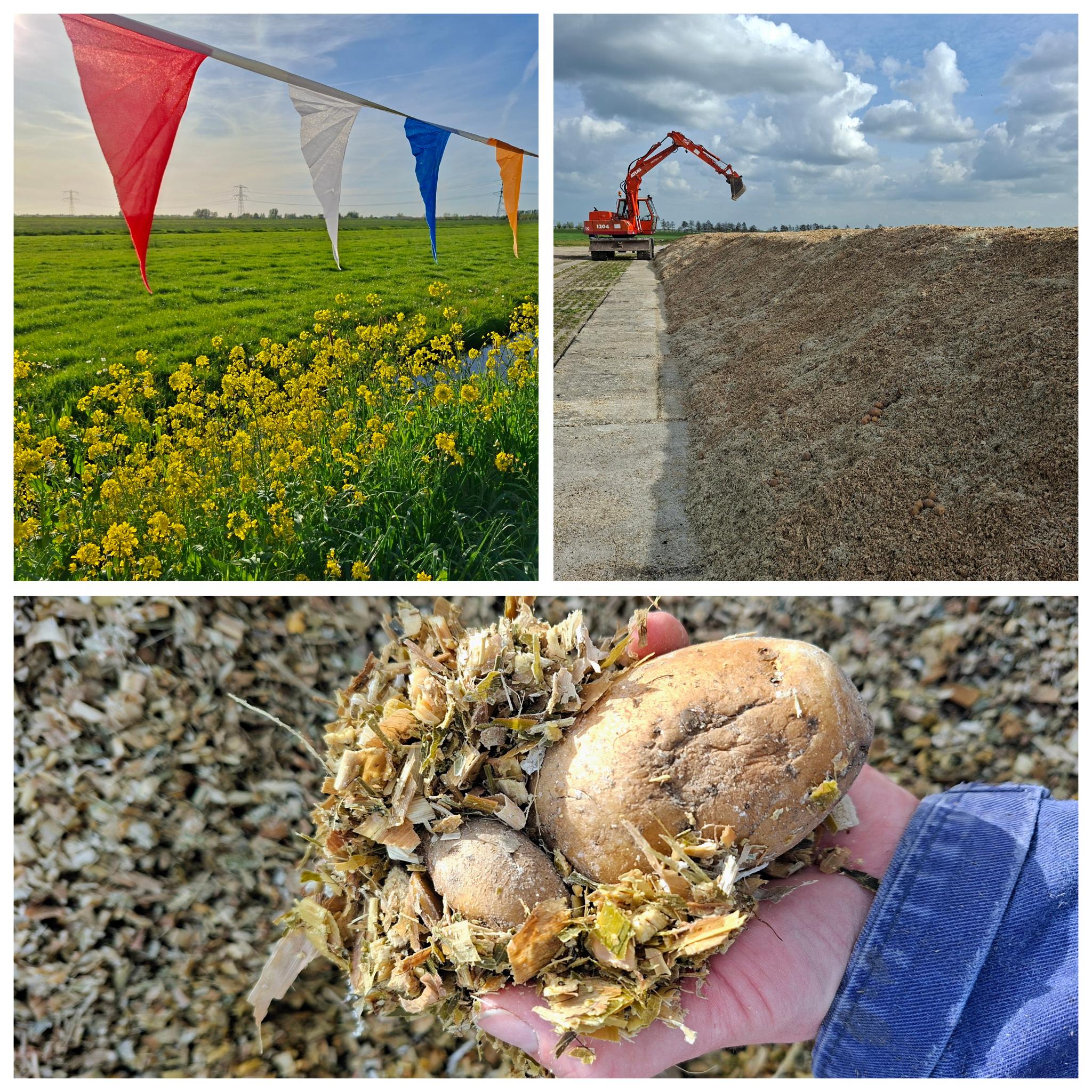 Afgelopen week zijn we druk bezig geweest met het inkuilen van aardappels. Achter de stal hebben we een grote hoop gras liggen, een graskuil. Daarnaast hebben we een maiskuil en een bietenpulp kuil liggen. Bietenpulp is een restproduct. Bietenpulp blijft over bij de productie van suiker uit suikerbieten. Het kan goed aan koeien en varkens gevoerd worden. Door alle drie de kuilen hebben we aardappels laten mengen. Aardappels zijn zetmeelrijk. Ze zijn een extra energiebron voor de koeien. Daarnaast vinden koeien ze erg lekker. Binnenkort kunnen de koeien genieten van aardappels door hun rantsoen.